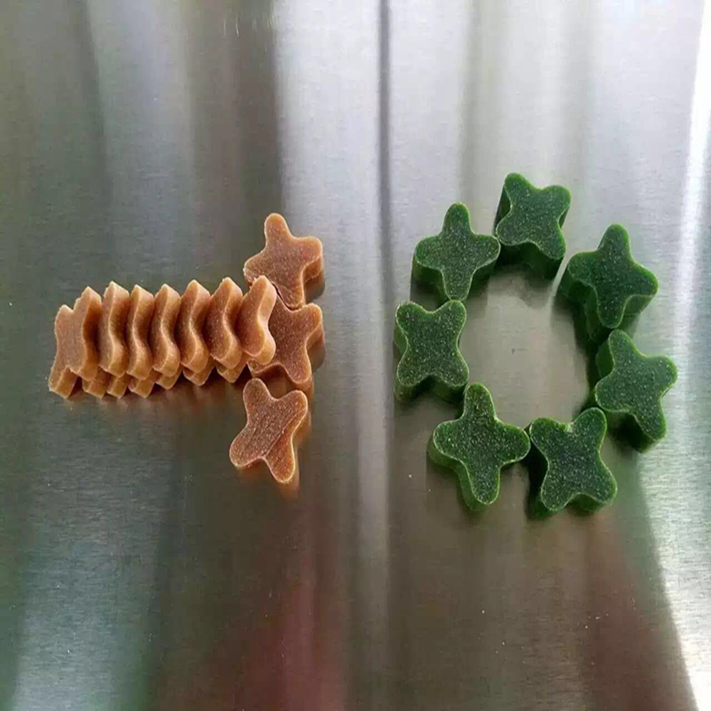 La goma de mascar para perros está científicamente proporcionada a diferentes materiales, que son extruidos por la extrusora de tornillo para hacer goma de mascar para alimentos para mascotas en forma de palos, huesos y otras formas diversas. No solo puede proporcionar algunas aplicaciones esenciales para perros, como: proteínas, grasas, vitaminas, etc., sino también moler los dientes de perro para satisfacer el pasatiempo de masticar del perro. Al mismo tiempo, también puede fortalecer las encías y los huesos frontales. limpiar la boca y eliminar el sarro. , Reduzca la infección de la enfermedad, mastique regularmente y cepille sus dientes regularmente para retardar la formación de placa y sarro, y reducir la formación de gingivitis y otras impurezas. Las encías pican durante la dentición en un cachorro, lo que no solo alivia el dolor, sino que también protege los artículos del hogar contra daños.